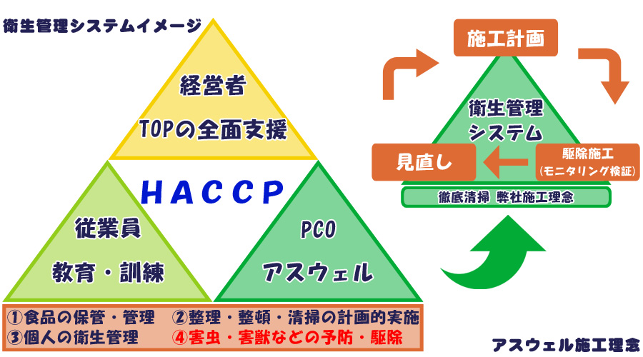 弊社では、お客様にとって「確実な成果」と「安心できるパートナーとしての役割」が、今後大きく必要とされることと考え「HACCP原則」を施工、お客様との信頼関係の中に取り入れさせていただいております。